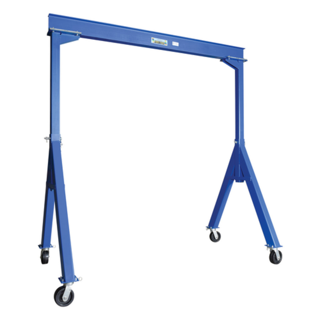 The fixed height steel gantry crane is designed for transporting and positioning materials along the beams length. The solid steel construction will provide years of service, while the painted blue finish will keep the models protected from surface ware. The rigging locks in 1 of 4 positions; you can set the wheels and push the gantry crane forward, back, left or right. The unit is an economical and efficient way to lift and raise products, diminishing the need of additional personnel. The fixed height design allows for constant use in a particular setting without the need to maneuver the overall height of the unit.