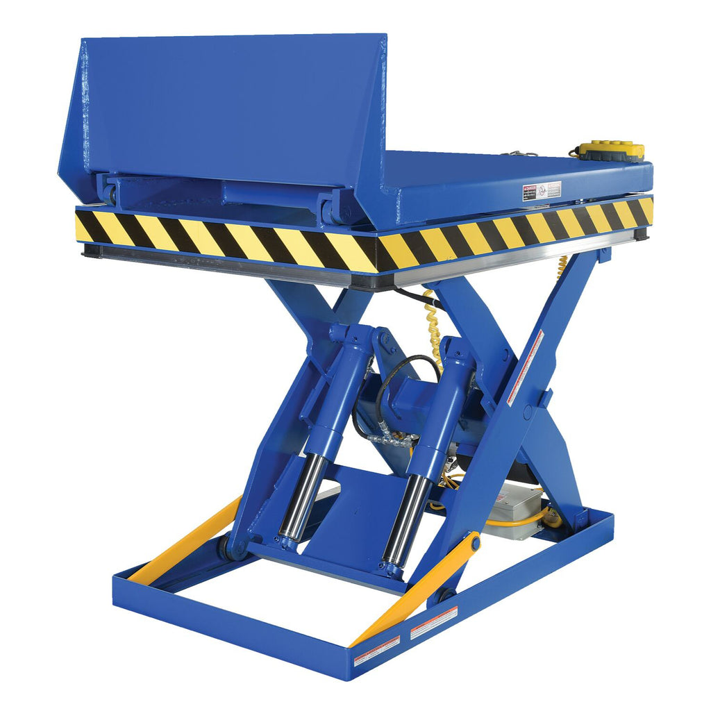 The lift and tilt scissor lift performs both lifting and tilting operations. There is a restraining chain and lip to keep the load in place during tilting. Safety features include an electric toe guard to protect workers from pinch points during lowering of the table, velocity fuses to hold platform position in the event of a hose or fitting failure, four (4) push-button hand pendent control, upper limit switch to stop travel at maximum height and reduce motor wear, and maintenance prop. The end tilt is standard with a side tilt available. There is optional accordion skirting available for both the lifting and tilting portions of the table.
