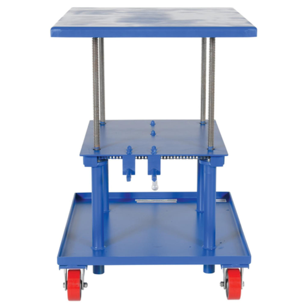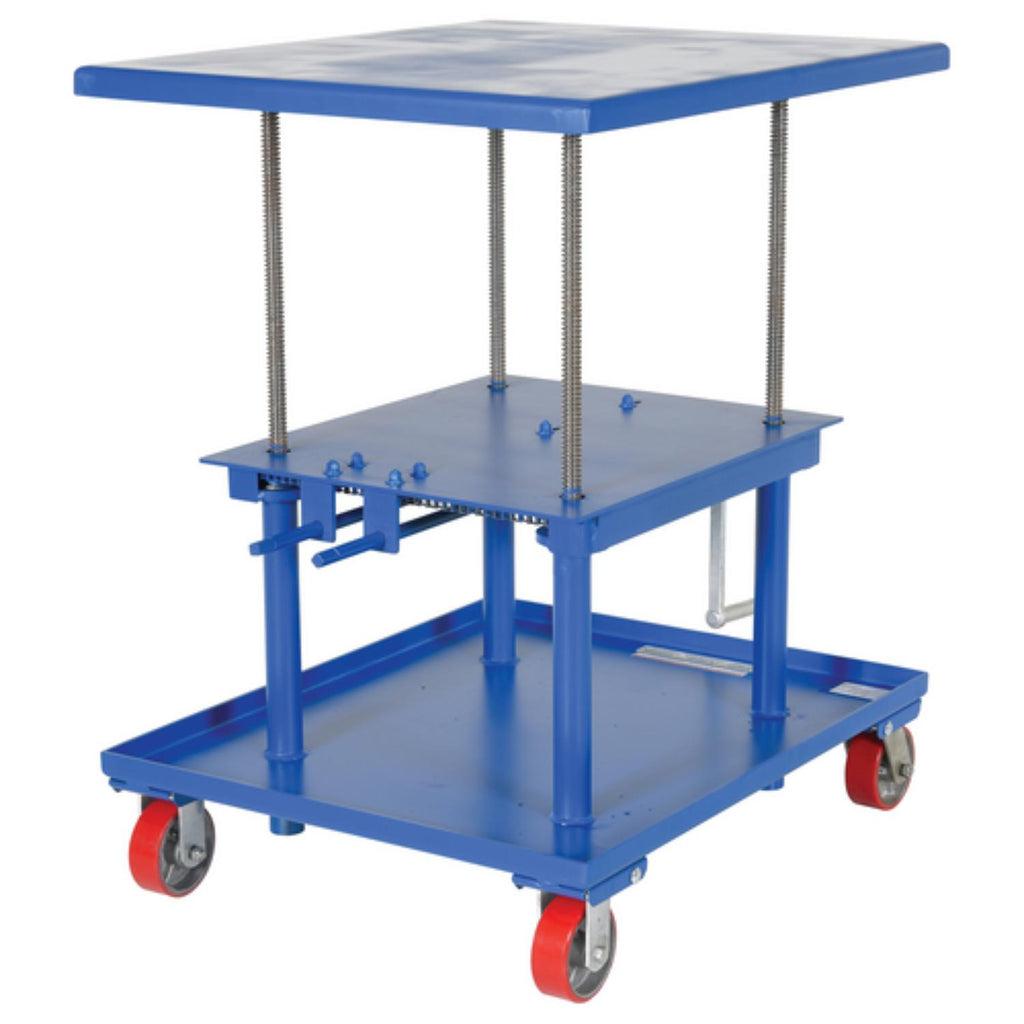 The mechanical post table is an adjustable portable table that is well suited for a wide variety of material handling applications. It moves smoothly on two rigid and two swivel poly-on-steel casters. Includes bolted on adjustable floor lock. Provides positive height adjustment without a downward shift. It features a two-speed manual gear mechanism to move heavy loads.