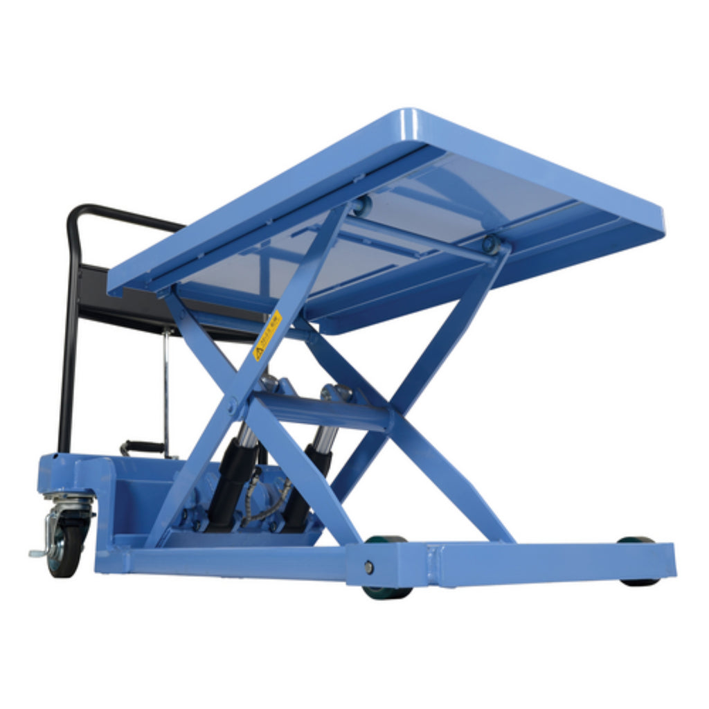 The Heavy Duty rough terrain scissor carts are designed for landscaping and construction sites. The unit is ergonomically friendly with very little bending and lifting needed. The design is compact for when limited space is available. The welded steel construction with powder coat blue finish can endure traversing over rough terrain on a daily basis.