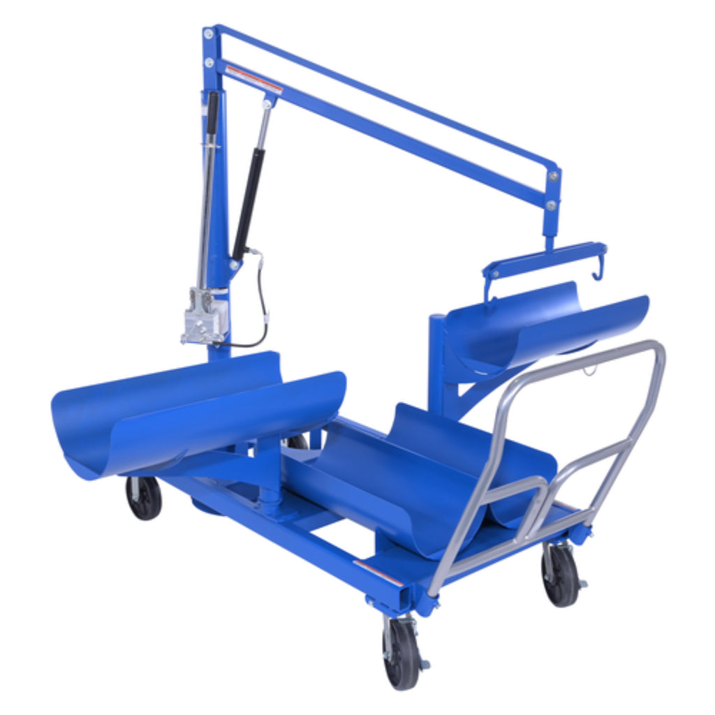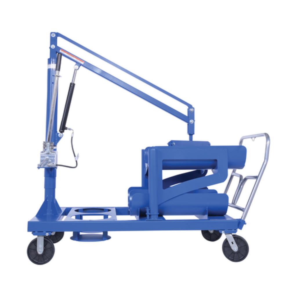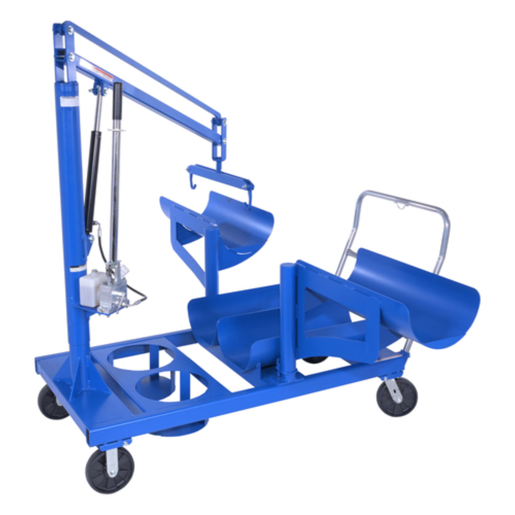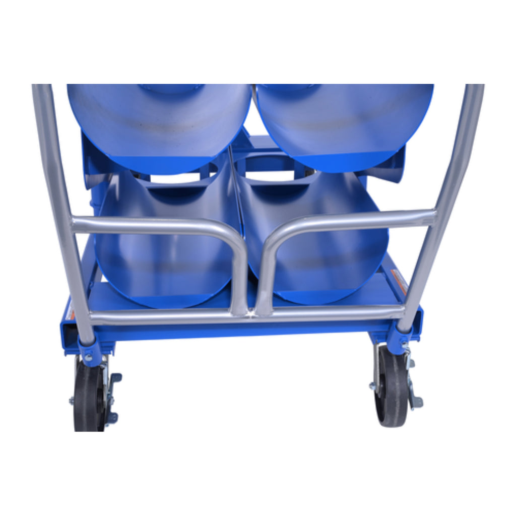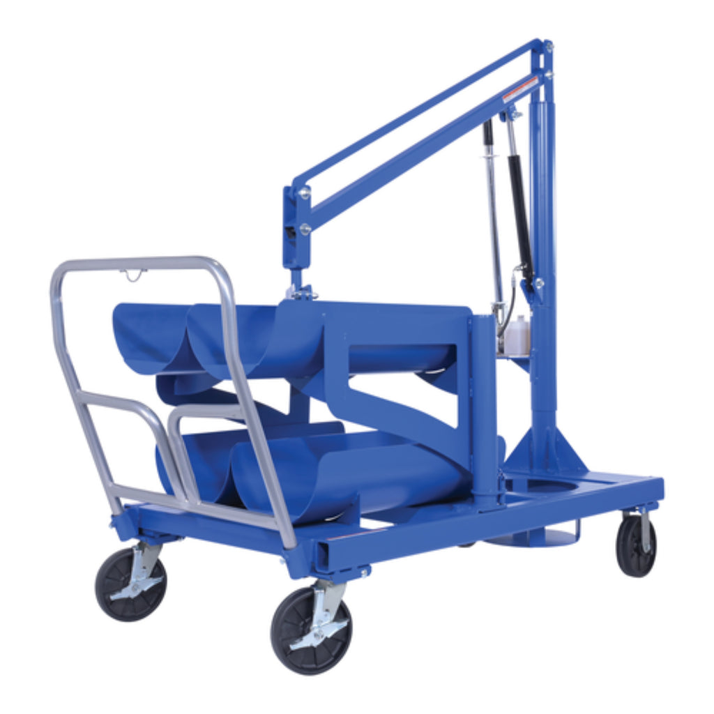 Finally an easy answer to lifting, storing, and transporting problems associated with LP tanks. This all-in-one LP tank truck allows users to transport LP tanks where needed. The built-in crane can be used to safely load full tanks into fork trucks. The crane pivots for maximum versatility. The crane boom is raised and lowered with a manual hand pump hydraulic lift. The tank attachment at the end of the boom automatically clamps to each end of the cylinder. The built-in racks are ideal for LP tank storage-racks. Store two (2) tanks in the vertical position and four (4) tanks in the horizontal position. Truck includes a push handle with casters for portability.
