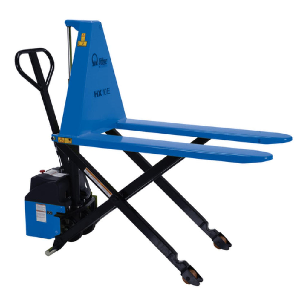 The portable high rise pallet lifter is ideal for the packaging and stocking departments. The unit is constructed of steel for strong support and durability during day to day use. The green color lends itself to clear visibility from across crowded workplaces. A push button can be utilized to cut off functionality of the pallet lifter in the case of an emergency. To use, simply slide forks of the unit through the pallet openings and lift to desired height.