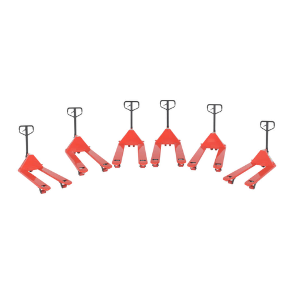 The full featured pallet truck, in a six (6) pack, is an economical way for one person to move heavy pallet loads without the use of a fork truck! Includes two (2) articulating steering wheels and two (2) front load rollers. The ergonomic design requires only seventy-five (75) pounds of pulling force when fully loaded. Steering wheels include bearing dust covers for added life. Nose wheels are located on the front edge of each fork to assist in clean pallet entrance and exit. Reinforced triple-formed steel forks provide twice the strength of standard single-formed forks. The unit is equipped with internally mounted solid steel adjustable push rods. The spring loaded handle automatically returns to vertical position when not in use. Hydraulic pump design facilitates easy-access seal replacement. Chrome-plated hydraulic pump piston for long seal life.