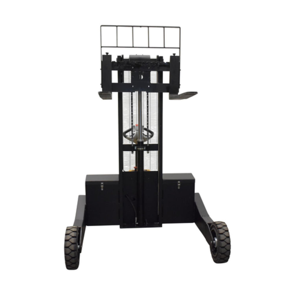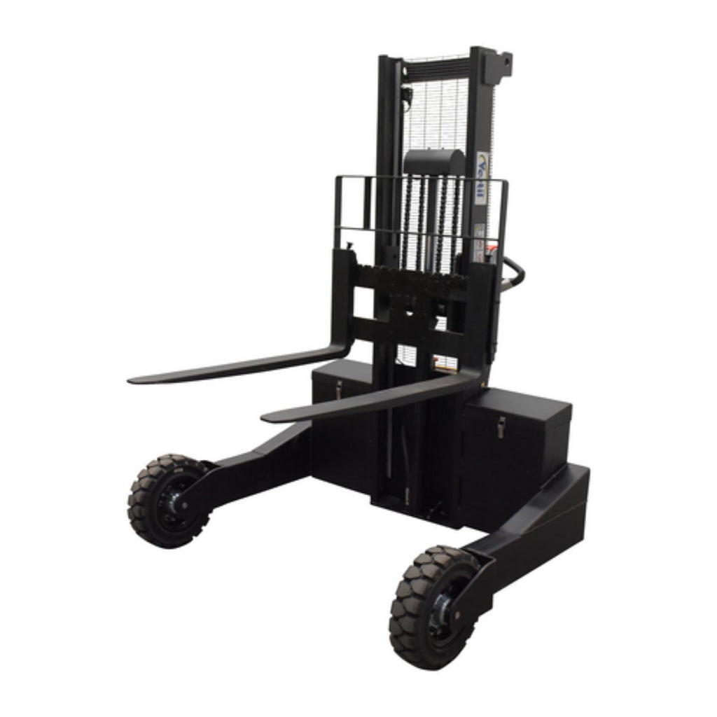 When goods have to be transferred over uneven and rough surfaces, look no further than the electric powered rough terrain stacker. With its large front and back rubber tires this unit can easily be used both indoors and out. A multi-function driving handle features an infinite speed adjustment, simple controls for finding the perfect height, and an emergency reverse function. Emergency reverse belly switch instantly reverses direction and moves the unit forward (away from the operator). Forks are adjustable to precisely fit what is being maneuvered. And, even more, the unit is equipped with batteries, integral battery charger, horn and battery level indicator.