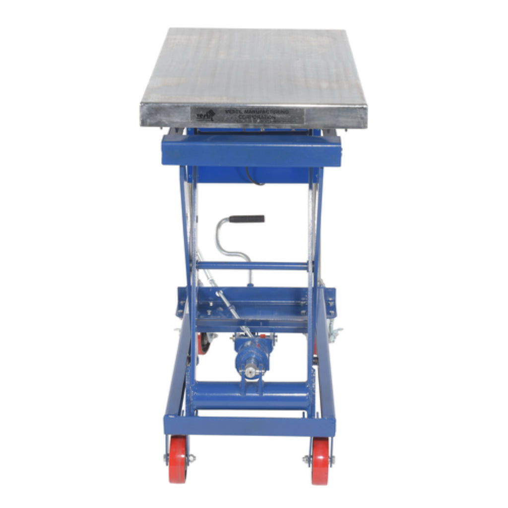 The Scissor Cart with built-In scale is ideal for parts counting, inventory rooms, or shipping weights at the loading dock. Provides an ergonomic workstation while sitting or standing. The wheels are poly-on-poly. Features an internal safety velocity fuse in each cylinder.