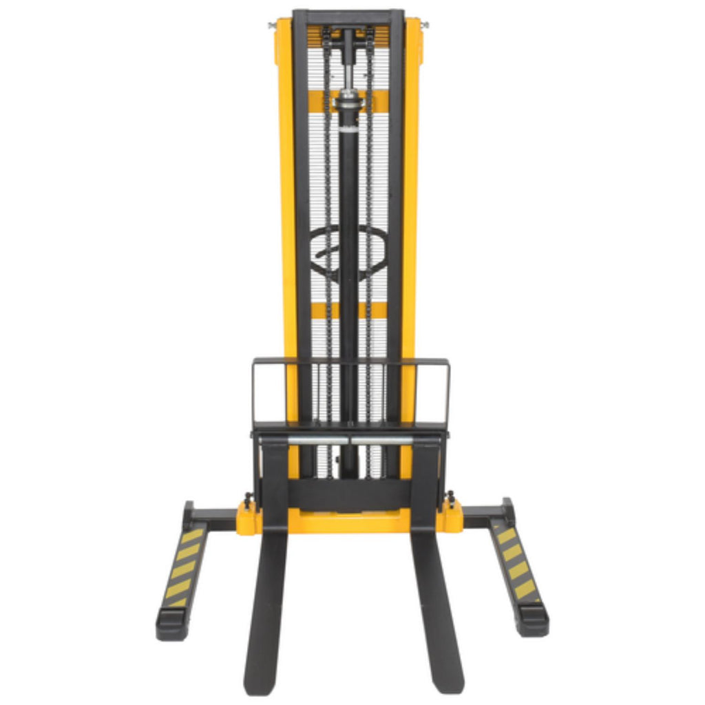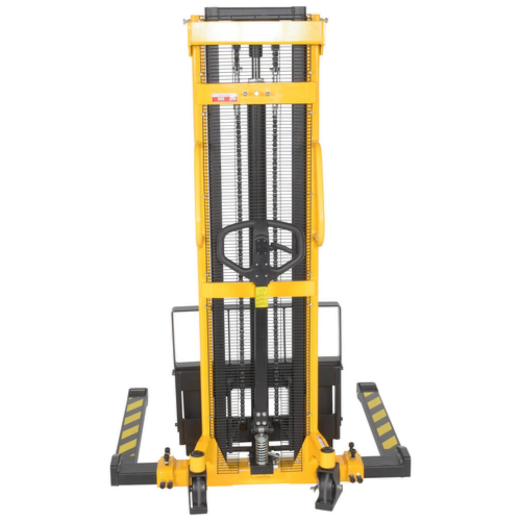 Manual Hydraulic hand pump stackers are sturdy and compact to fit through standard height doors. Forks are raised by manual hydraulic hand pump operation and released by a lever situated on the handle. 1" lift per handle pump. Two rigid and two swivel wheels standard.