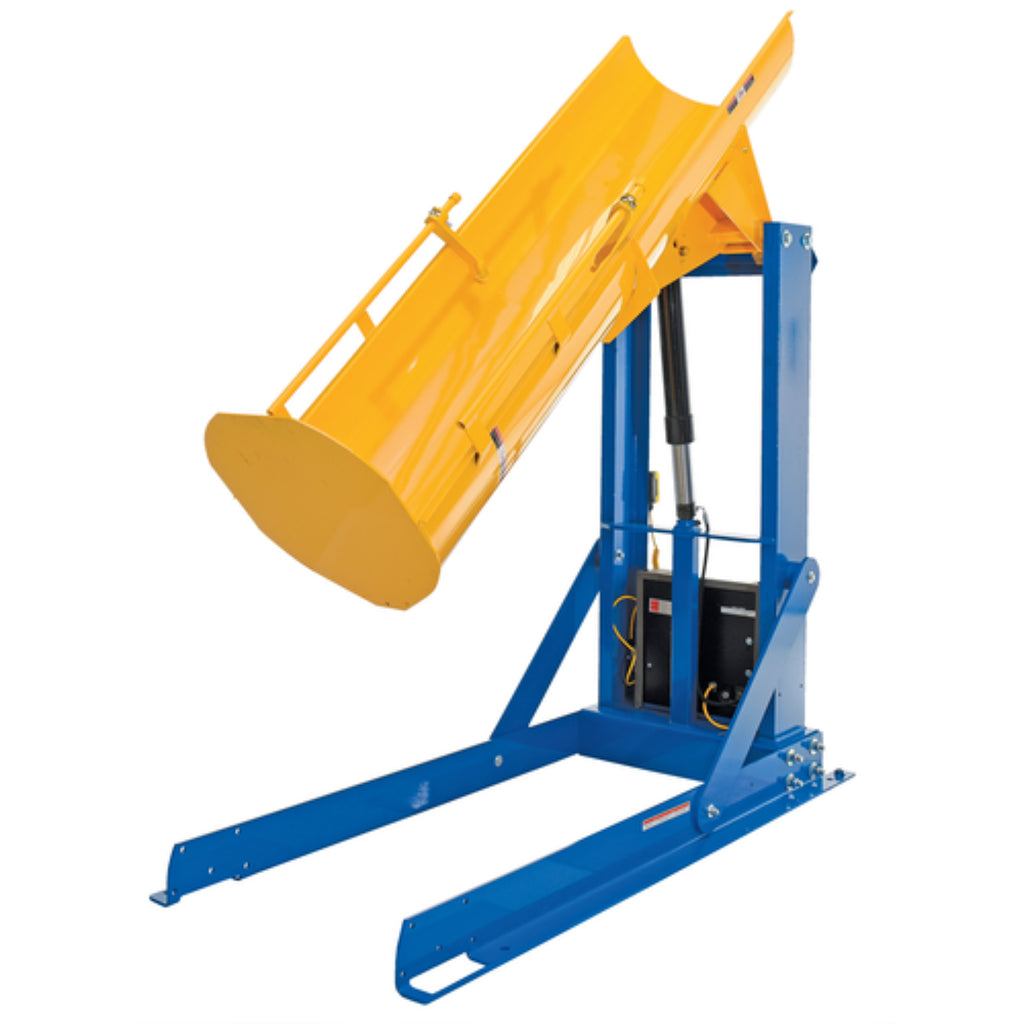The Hydraulic drum dumper is what you need to dump heavy drums. Works with plastic, steel, and fiber drums. This dumper has a solid steel chute and all steel construction. Upper travel limit switch, emergency brass safety velocity fuse in cylinder, and vertical adjustment drum restraints are standard. Dumper is operated with a hand held control on a coil cord standard.